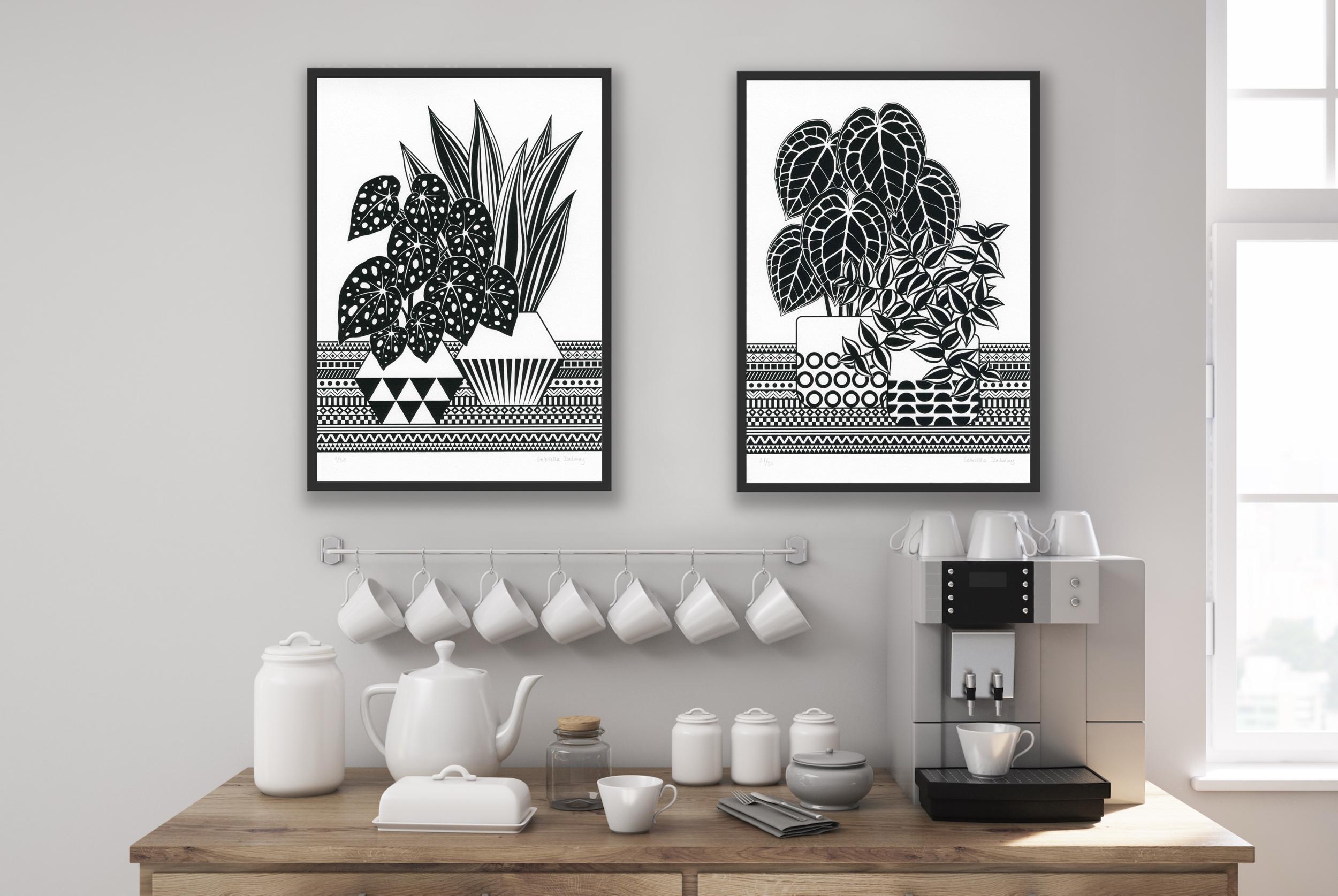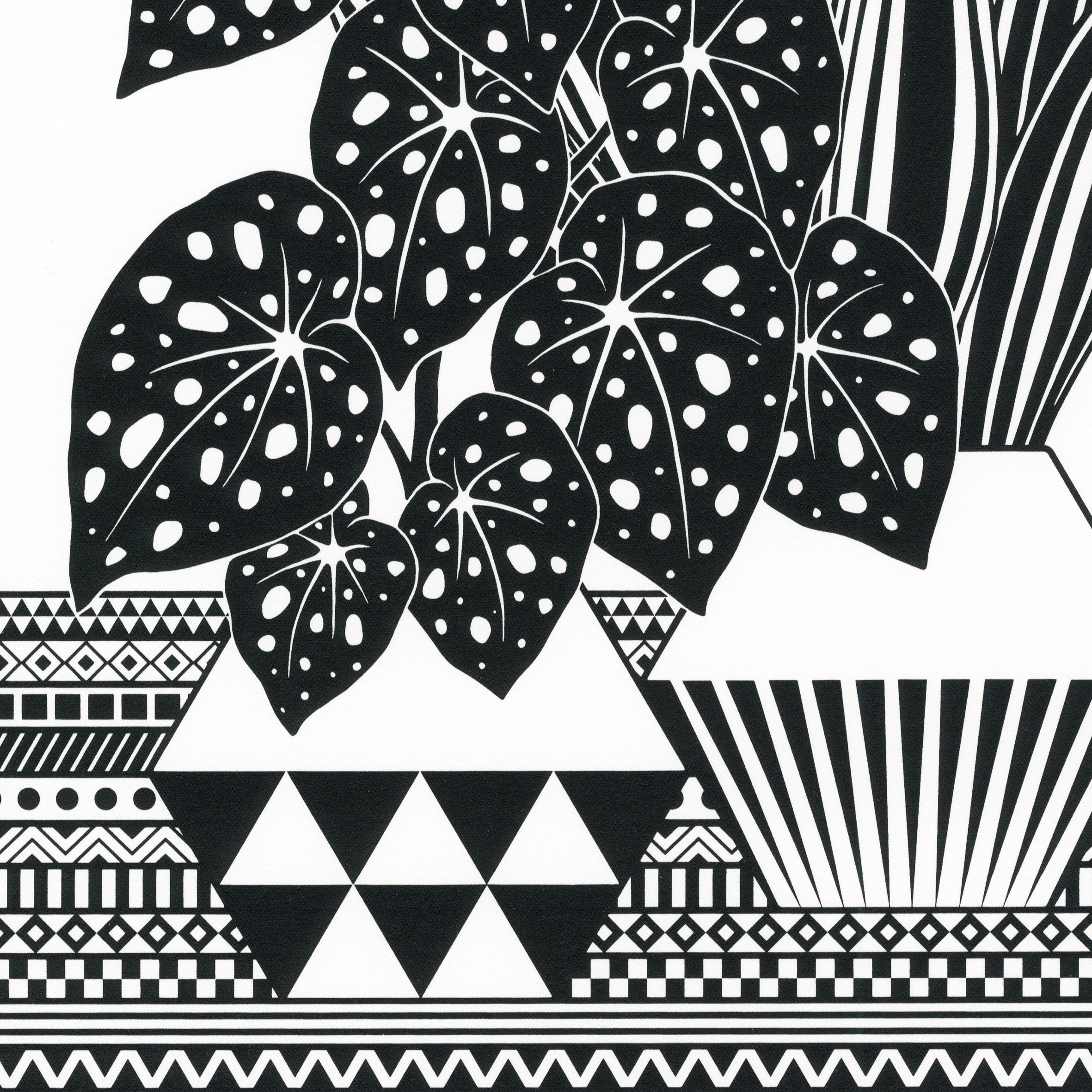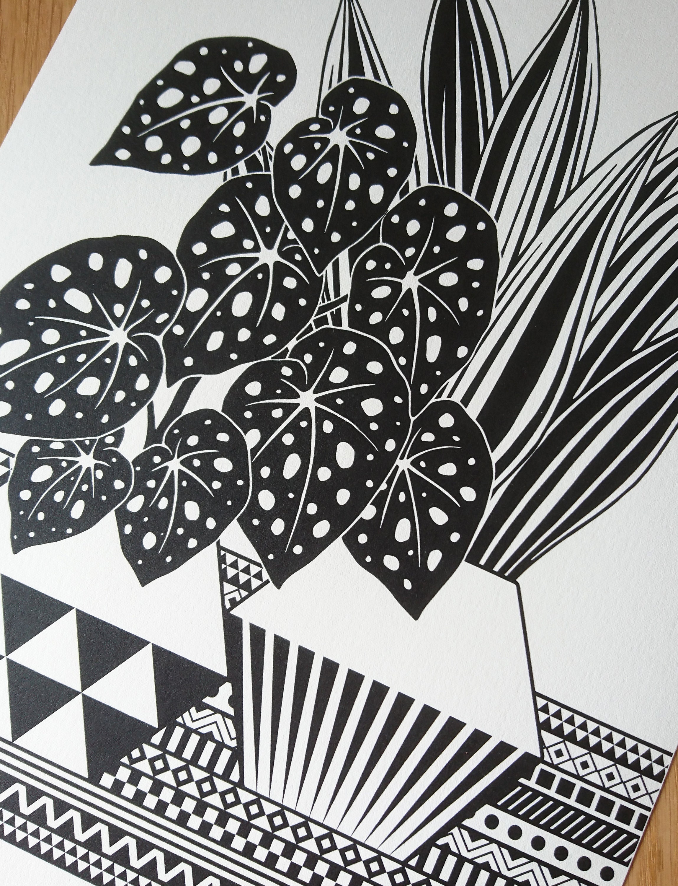 Contemporary original screen print based on my illustration of Begonia and Sansevieria plants with geometric background, printed by me on heavyweight printing paper, numbered and signed.