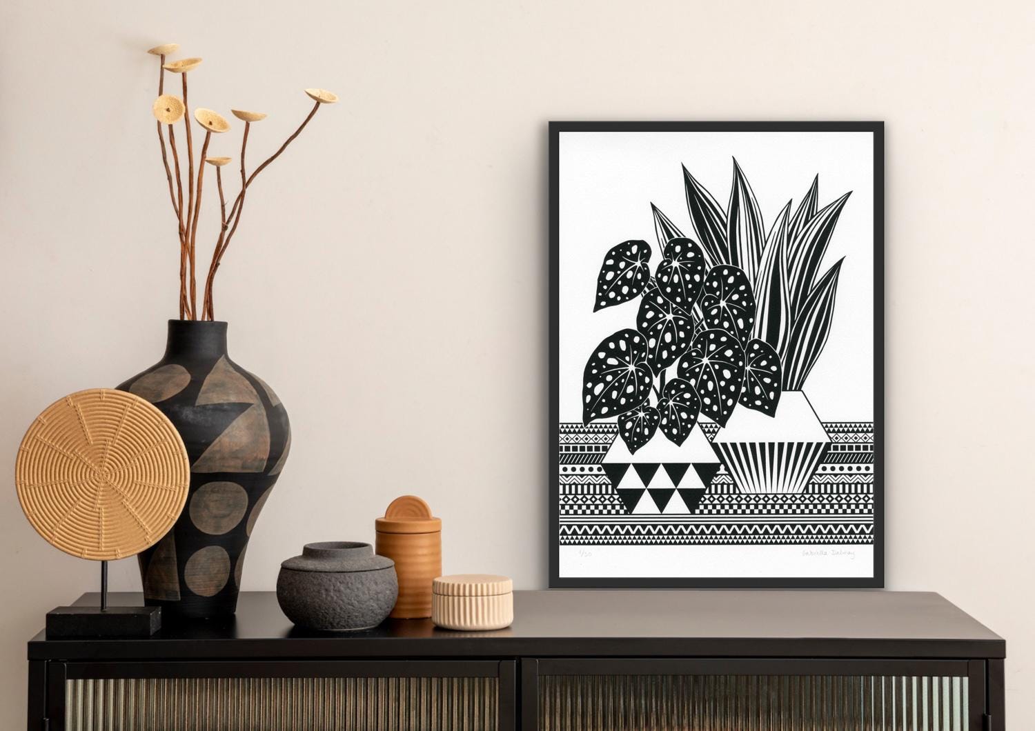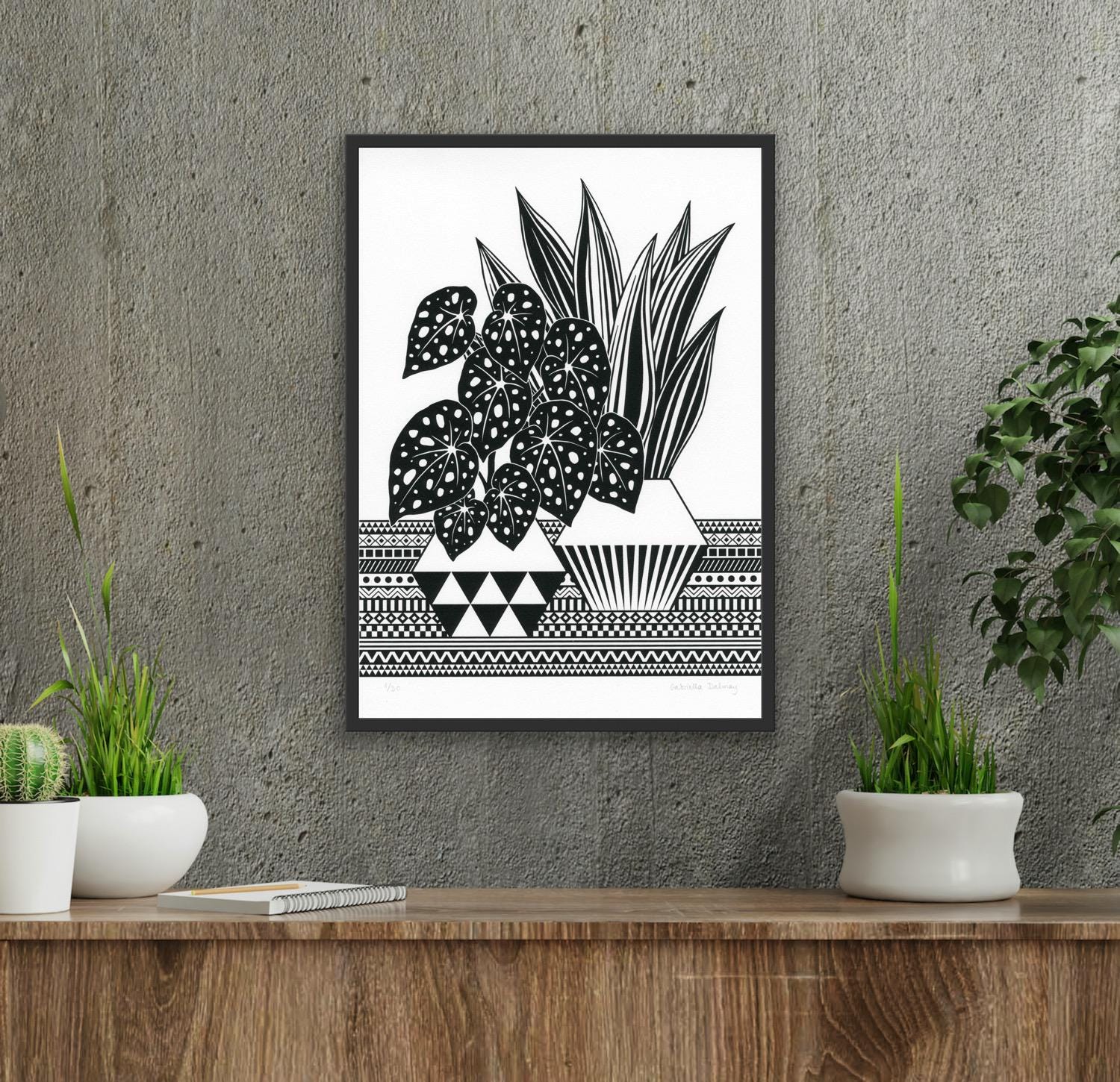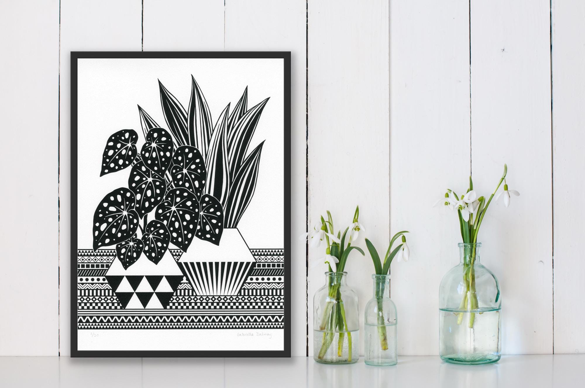 Contemporary original screen print based on my illustration of Begonia and Sansevieria plants with geometric background, printed by me on heavyweight printing paper, numbered and signed.